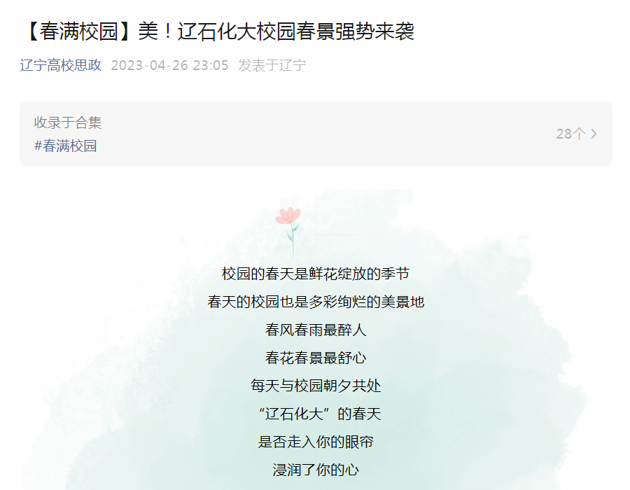 編者按:4月26日,遼寧高校思政微信公眾號發布了微文《美!遼石化大校園春景強勢來襲》,對我校的美麗校園春景進行了宣傳報道。現將相關報道轉載如下:
