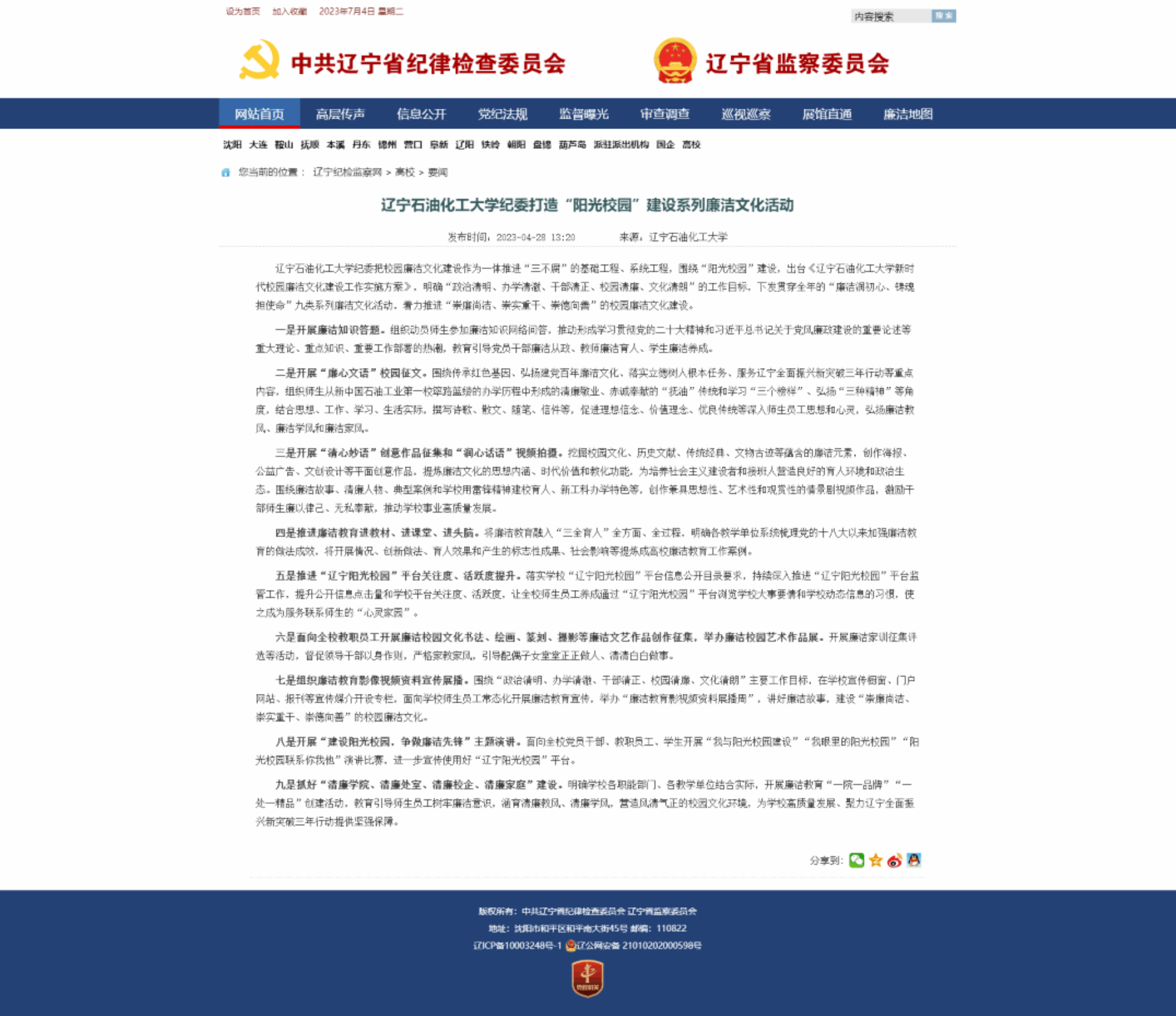 編者按:2023年4月28日,遼寧紀檢監(jiān)察網(wǎng)以《遼寧石油化工大學(xué)紀委打造“陽光校園”建設(shè)系列廉潔文化活動》為題,對學(xué)校圍繞“陽光校園”建設(shè),出臺《遼寧石油化工大學(xué)新時代校園廉潔文化建設(shè)工作實施方案》,明確“政治清明、辦學(xué)清澈、干部清正、校園清廉、文化清朗”的工作目標,陸續(xù)開展貫穿全年的“廉潔潤初心、鑄魂擔(dān)使命”九類系列廉潔文化活動,著力推進“崇廉尚潔、崇實重干、崇德向善”的校園廉潔文化建設(shè)情況進行了宣傳報道。現(xiàn)將相關(guān)報道轉(zhuǎn)載如下:
