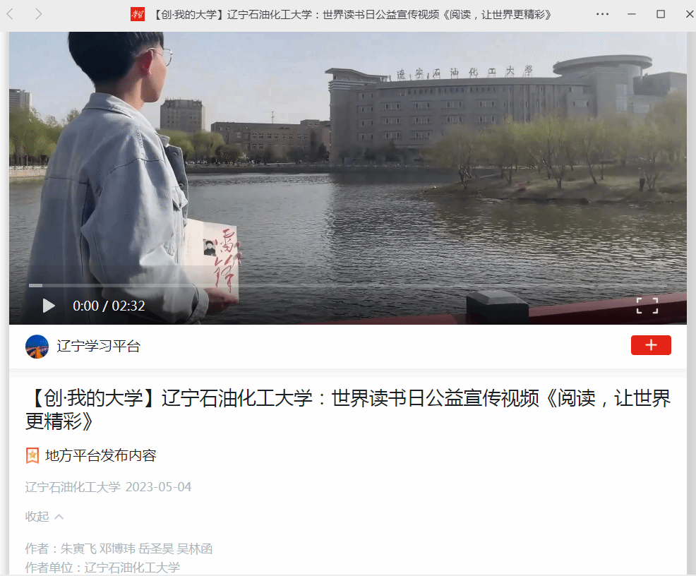 編者按:近日,學(xué)習(xí)強國遼寧學(xué)習(xí)平臺、人民日報客戶端·人民號、遼寧日報·北國號等媒體平臺對我校石油天然氣工程學(xué)院師生制作的世界讀書日公益宣傳視頻《閱讀,讓世界更精彩》進行了宣傳報道。現(xiàn)將相關(guān)報道轉(zhuǎn)載如下: