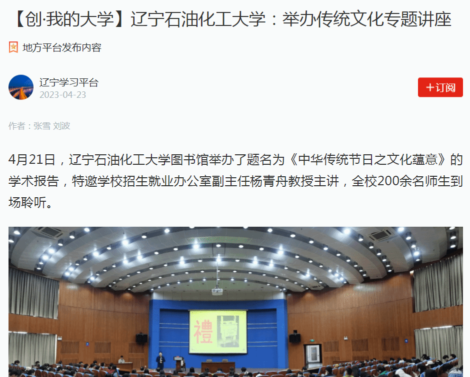 編者按:近日,學(xué)習(xí)強(qiáng)國(guó)遼寧學(xué)習(xí)平臺(tái)、遼寧日?qǐng)?bào)·北國(guó)號(hào)、人民日?qǐng)?bào)客戶(hù)端·人民號(hào)等媒體平臺(tái)對(duì)我校圖書(shū)館舉辦了題名為《中華傳統(tǒng)節(jié)日之文化蘊(yùn)意》的學(xué)術(shù)報(bào)告,特邀學(xué)校招生就業(yè)辦公室副主任楊青舟教授主講,全校200余名師生到場(chǎng)聆聽(tīng)進(jìn)行了宣傳報(bào)道。現(xiàn)將相關(guān)報(bào)道轉(zhuǎn)載如下: