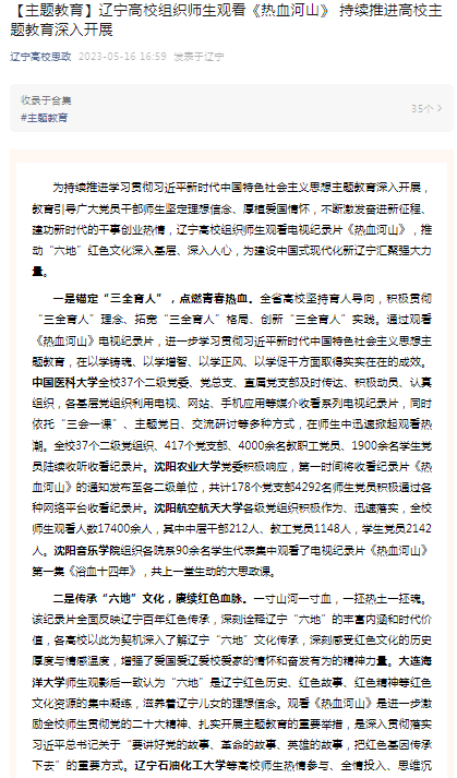 編者按:近日,遼寧高校思政微信公眾號、中央廣電總臺國際在線、云盛京、北國·遼寧日報等媒體平臺對遼寧高校組織師生觀看電視紀錄片《熱血河山》,推動“六地”紅色文化深入基層、深入人心,為建設中國式現(xiàn)代化新遼寧匯聚強大力量進行了宣傳,其中對我校師生熱情參與、全情投入、思維沉浸,觀劇活動取得良好效果進行了組稿報道。現(xiàn)將相關報道轉載如下: