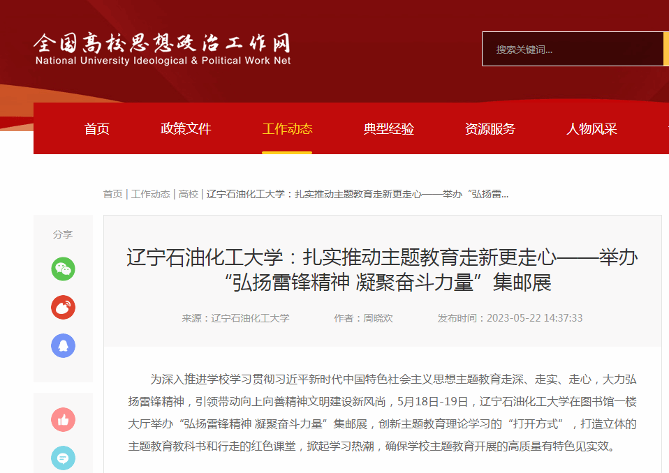 編者按:近日,全國(guó)高校思想政治工作網(wǎng)、撫順電視臺(tái)、遼寧日?qǐng)?bào)·北國(guó)號(hào)等媒體平臺(tái)對(duì)我校在圖書(shū)館一樓大廳舉辦“弘揚(yáng)雷鋒精神 凝聚奮斗力量”集郵展,創(chuàng)新主題教育理論學(xué)習(xí)的“打開(kāi)方式”,打造立體的主題教育教科書(shū)和行走的紅色課堂,掀起學(xué)習(xí)熱潮,確保學(xué)校主題教育開(kāi)展的高質(zhì)量有特色見(jiàn)實(shí)效進(jìn)行了宣傳報(bào)道。現(xiàn)將相關(guān)報(bào)道轉(zhuǎn)載如下: