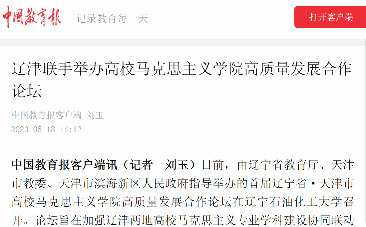 編者按:近日,中國教育報客戶端、人民網(wǎng)等媒體平臺對我校為加強遼津兩地高校馬克思主義專業(yè)學(xué)科建設(shè)協(xié)同聯(lián)動發(fā)展,促進雙方教學(xué)科研工作協(xié)作深度融合,進一步鞏固馬克思主義理論教育教學(xué)陣地,建強馬克思主義理論人才培養(yǎng)基地,召開首屆遼寧省·天津市高校馬克思主義學(xué)院高質(zhì)量發(fā)展合作論壇進行了宣傳報道。現(xiàn)將相關(guān)報道轉(zhuǎn)載如下:
