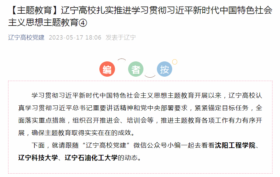 編者按:近日,遼寧高校黨建微信公眾號對遼寧高校認真學習貫徹習近平總書記重要講話精神和黨中央部署要求,緊緊錨定目標任務(wù),全面落實重點措施,組織召開推進會、培訓會等,推進主題教育各項工作有力有序開展,確保主題教育取得實實在在的成效進行了宣傳,其中對我校召開學習貫徹習近平新時代中國特色社會主義思想主題教育領(lǐng)導小組工作會議進行了組稿報道。現(xiàn)將相關(guān)報道轉(zhuǎn)載如下: