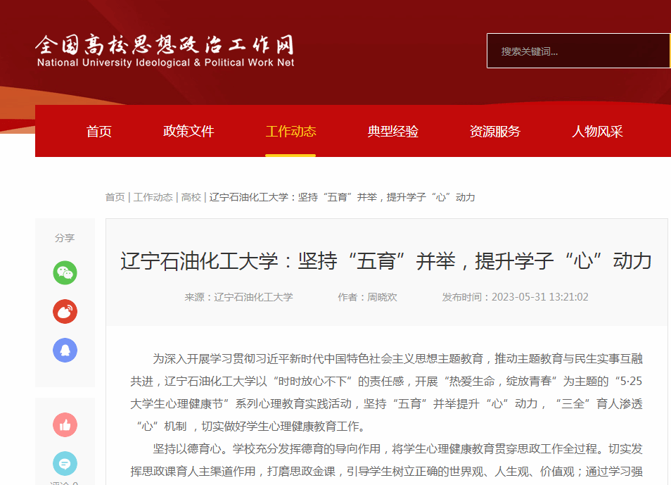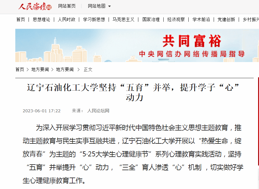 編者按:近日,人民論壇網(wǎng)、中國大學(xué)生在線、全國高校思想政治工作網(wǎng)、遼寧日報·北國號、人民日報客戶端·人民號對我校深入開展學(xué)習(xí)貫徹習(xí)近平新時代中國特色社會主義思想主題教育,推動主題教育與民生實事互融共進(jìn),以“時時放心不下”的責(zé)任感,開展“熱愛生命,綻放青春”為主題的“5·25大學(xué)生心理健康節(jié)”系列心理教育實踐活動,堅持“五育”并舉提升“心”動力,“三全”育人滲透“心”機(jī)制,切實做好學(xué)生心理健康教育工作進(jìn)行了宣傳報道。現(xiàn)將相關(guān)報道轉(zhuǎn)載如下: