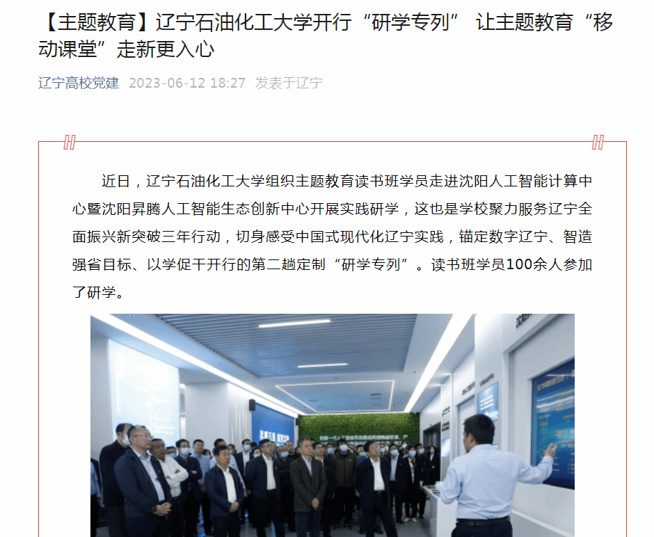 編者按:6月12日,遼寧高校黨建微信公眾號組織主題教育讀書班學(xué)員走進沈陽人工智能計算中心暨沈陽昇騰人工智能生態(tài)創(chuàng)新中心開展實踐研學(xué),這也是學(xué)校聚力服務(wù)遼寧全面振興新突破三年行動,切身感受中國式現(xiàn)代化遼寧實踐,錨定數(shù)字遼寧、智造強省目標、以學(xué)促干開行的第二趟定制“研學(xué)專列”進行了宣傳報道。現(xiàn)將相關(guān)報道轉(zhuǎn)載如下: