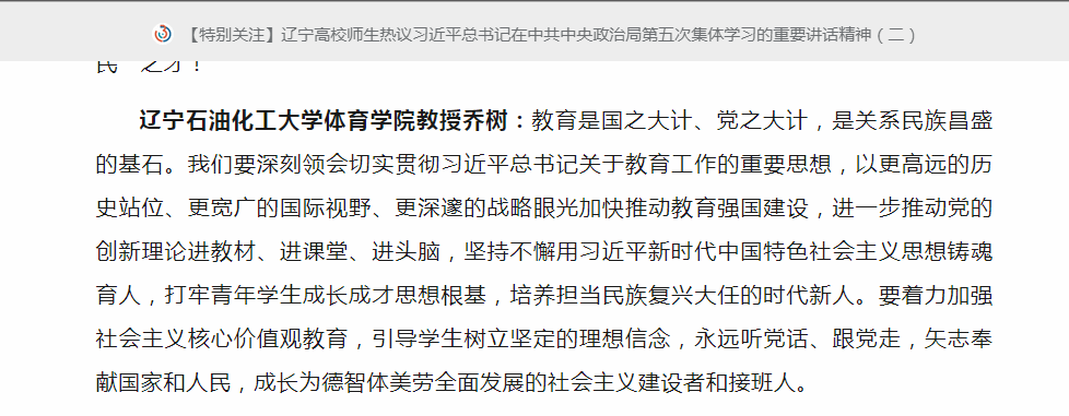 編者按:6月1日,遼寧高校思政微信公眾號以《遼寧高校師生熱議習(xí)近平總書記在中共中央政治局第五次集體學(xué)習(xí)的重要講話精神(二)》為題,組稿刊登了我校體育學(xué)院教授喬樹的感悟。現(xiàn)將相關(guān)報道轉(zhuǎn)載如下: