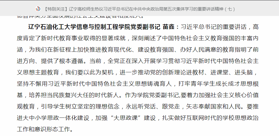 編者按:6月6日,遼寧高校思政微信公眾號以《遼寧高校師生熱議習近平總書記在中共中央政治局第五次集體學習的重要講話精神(七)》為題,組稿刊登了我校信息與控制工程學院黨委副書記苗鑫的感悟。現(xiàn)將相關報道轉載如下: