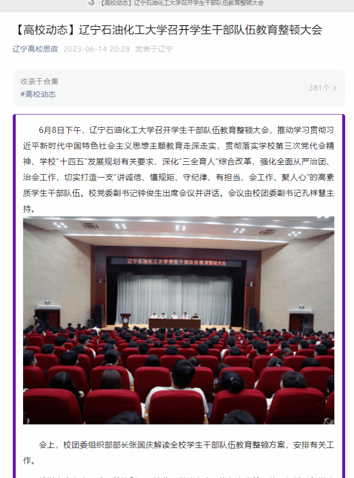 編者按:近日,遼寧高校思政微信公眾號(hào)以《遼寧石油化工大學(xué)召開(kāi)學(xué)生干部隊(duì)伍教育整頓大會(huì)》為題,對(duì)我校以學(xué)生干部隊(duì)伍規(guī)范化建設(shè)為抓手推動(dòng)學(xué)生工作提質(zhì)增效的做法進(jìn)行宣傳報(bào)道。現(xiàn)將相關(guān)報(bào)道轉(zhuǎn)載如下: