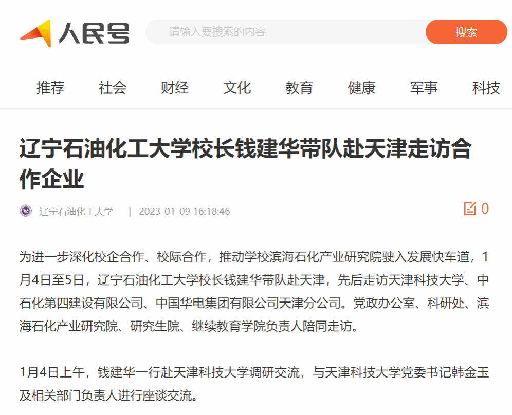 編者按:近日,遼寧日?qǐng)?bào)·北國(guó)號(hào)、人民日?qǐng)?bào)客戶端·人民號(hào)等媒體平臺(tái)對(duì)我校校長(zhǎng)錢建華帶隊(duì)赴天津,先后走訪天津科技大學(xué)、中石化第四建設(shè)有限公司、中國(guó)華電集團(tuán)有限公司天津分公司進(jìn)行了宣傳報(bào)道。現(xiàn)將相關(guān)報(bào)道轉(zhuǎn)載如下: