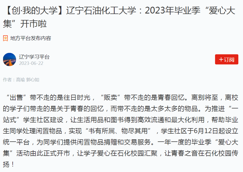 編者按:近日,學習強國遼寧學習平臺、遼寧日報·北國號、人民日報客戶端·人民號等媒體平臺對我校學生社區(qū)于6月12日起設立統(tǒng)一平臺,為同學們提供閑置物品捐贈和交易服務,“愛心大集”活動由此正式開市,讓學子愛心在石化校園匯聚,讓青春之音在石化校園傳揚進行了宣傳報道。現(xiàn)將相關(guān)報道轉(zhuǎn)載如下:
