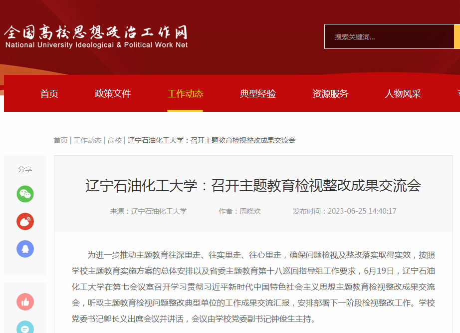 編者按:近日,全國高校思想政治工作網(wǎng)、遼寧日報(bào)·北國號(hào)對我校在第七會(huì)議室召開學(xué)習(xí)貫徹習(xí)近平新時(shí)代中國特色社會(huì)主義思想主題教育檢視整改成果交流會(huì),聽取主題教育檢視問題整改典型單位的工作成果交流匯報(bào),安排部署下一階段檢視整改工作進(jìn)行了宣傳報(bào)道。現(xiàn)將相關(guān)報(bào)道轉(zhuǎn)載如下: