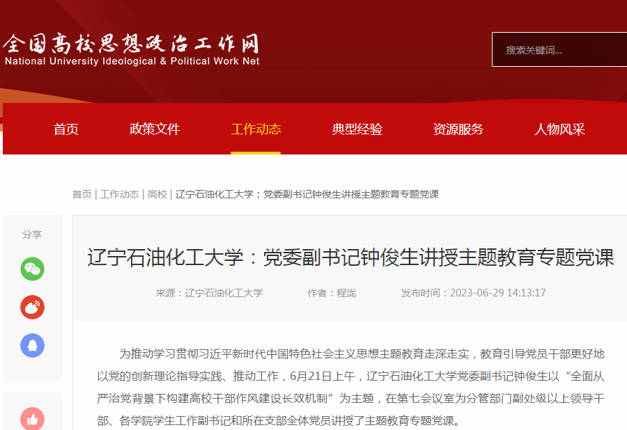 編者按:近日,全國高校思想政治工作網(wǎng)、遼寧日報·北國號等媒體平臺對我校黨委副書記鐘俊生以“全面從嚴治黨背景下構建高校干部作風建設長效機制”為主題,在第七會議室為分管部門副處級以上領導干部、各學院學生工作副書記和所在支部全體黨員講授了主題教育專題黨課進行了宣傳報道。現(xiàn)將相關報道轉載如下: