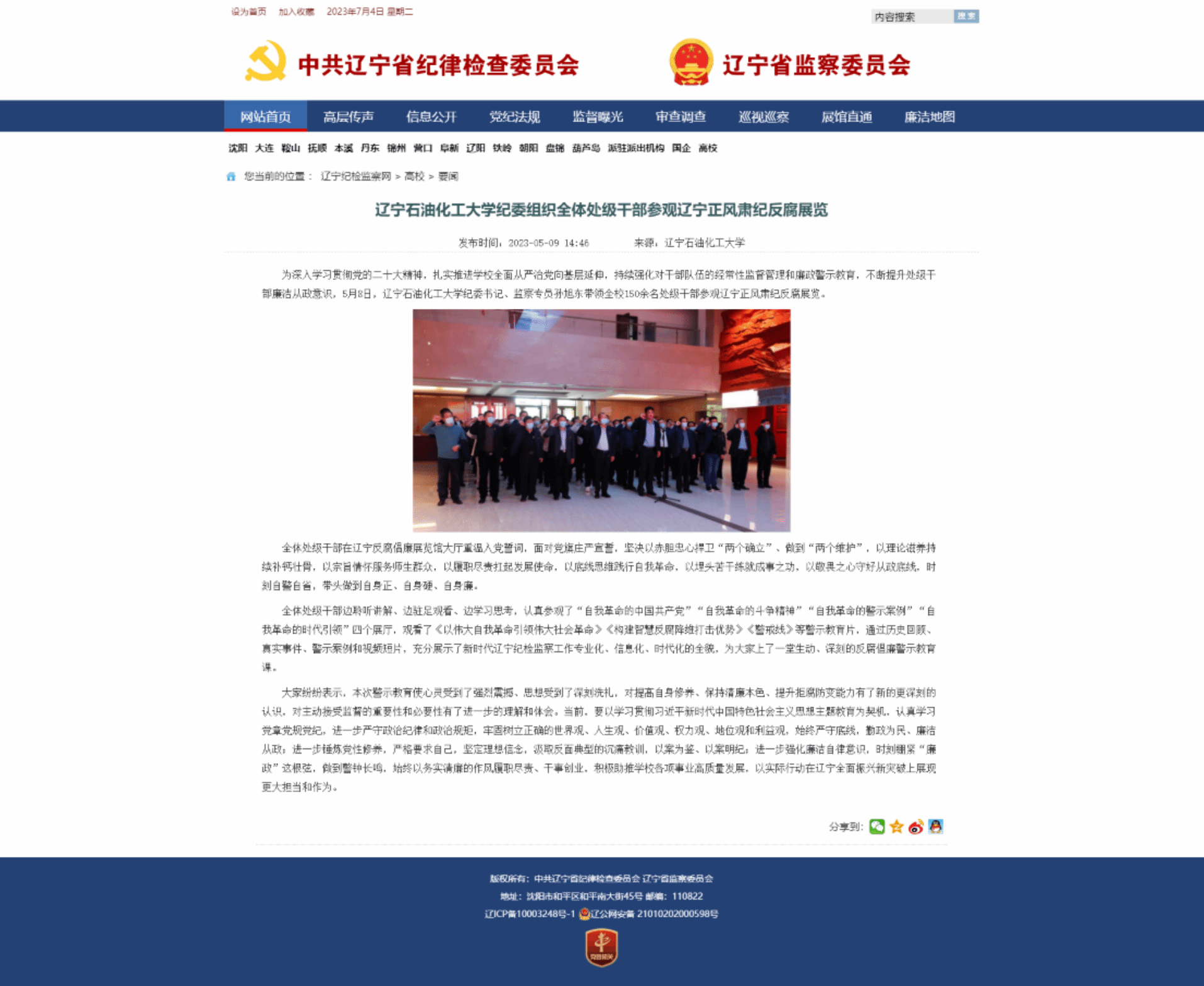 編者按:2023年5月9日,遼寧紀檢監(jiān)察網(wǎng)以《遼寧石油化工大學紀委組織全體處級干部參觀遼寧正風肅紀反腐展覽》為題,對學校持續(xù)強化對干部隊伍的經(jīng)常性監(jiān)督管理和廉政警示教育,全校150余名處級干部參觀遼寧正風肅紀反腐展覽進行了宣傳報道。現(xiàn)將相關(guān)報道轉(zhuǎn)載如下: