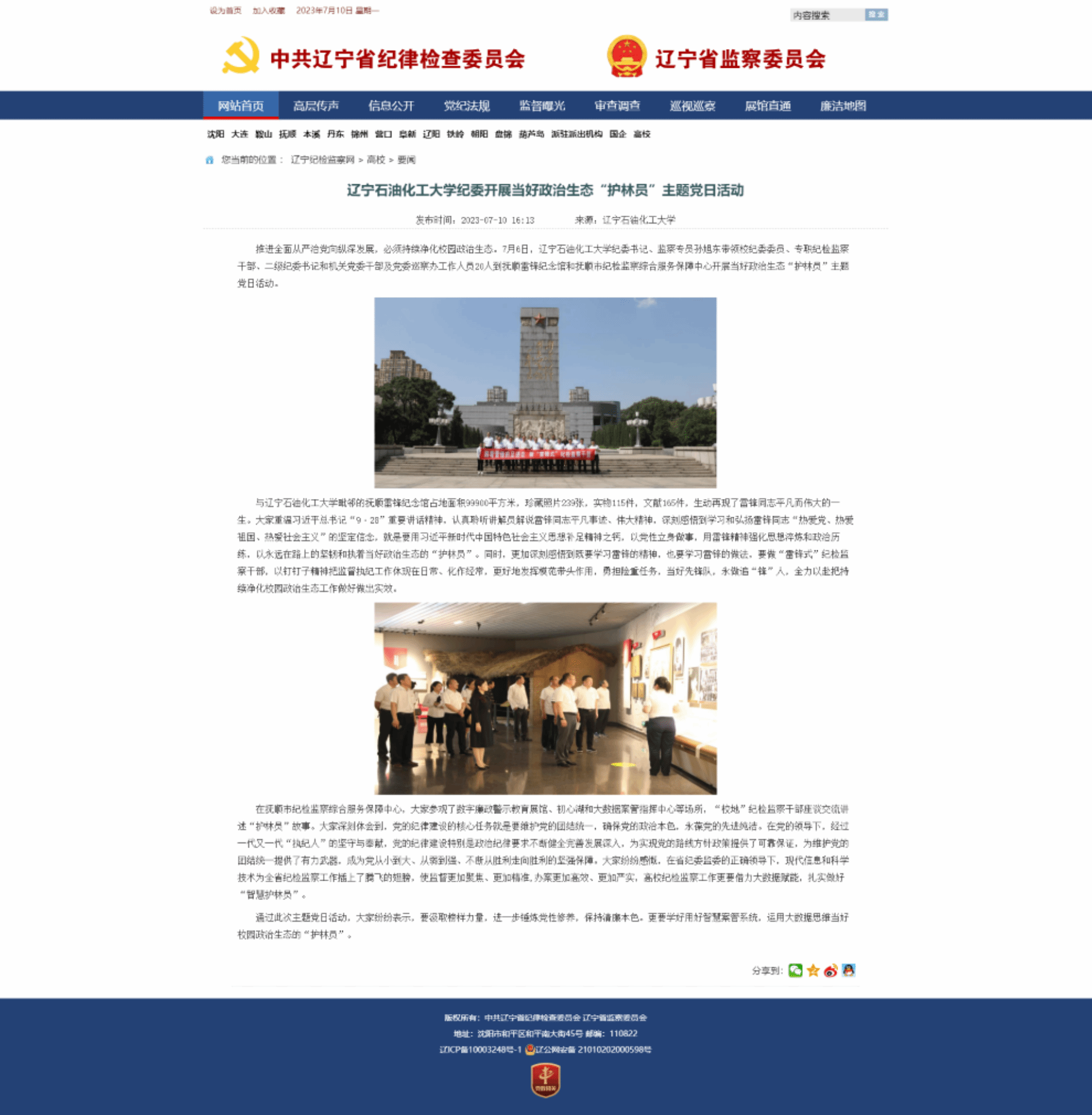 編者按:2023年7月6日,遼寧紀(jì)檢監(jiān)察網(wǎng)以《遼寧石油化工大學(xué)紀(jì)委開展當(dāng)好政治生態(tài)“護(hù)林員”主題黨日活動(dòng)》為題,對(duì)學(xué)校組織帶領(lǐng)校紀(jì)委委員、專職紀(jì)檢監(jiān)察干部、二級(jí)紀(jì)委書記和機(jī)關(guān)黨委干部及黨委巡察辦工作人員到撫順雷鋒紀(jì)念館和撫順市紀(jì)檢監(jiān)察綜合服務(wù)保障中心開展當(dāng)好政治生態(tài)“護(hù)林員”主題黨日活動(dòng)進(jìn)行了宣傳報(bào)道。現(xiàn)將相關(guān)報(bào)道轉(zhuǎn)載如下: