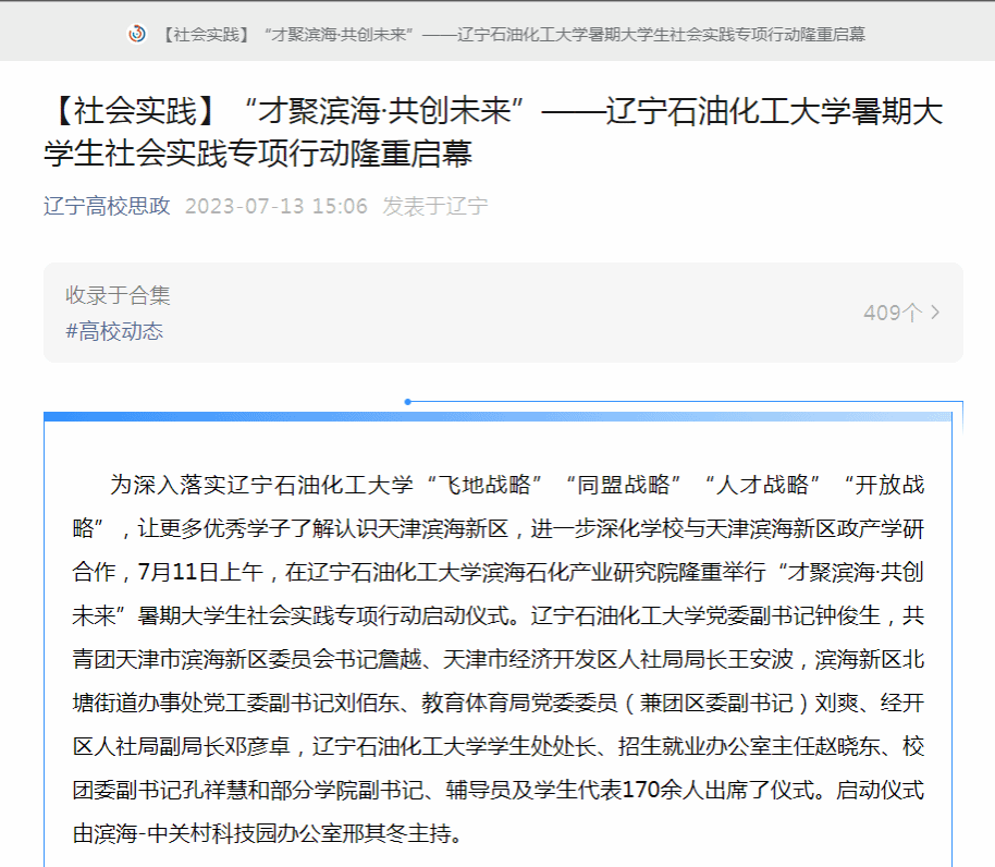 編者按:近日,全國高校思想政治工作網(wǎng)、遼寧高校思政微信公眾號、遼寧日報(bào)·北國號等媒體平臺對我校落實(shí)“飛地戰(zhàn)略”“同盟戰(zhàn)略”“人才戰(zhàn)略”“開放戰(zhàn)略”,讓更多優(yōu)秀學(xué)子了解認(rèn)識天津?yàn)I海新區(qū),進(jìn)一步深化學(xué)校與天津?yàn)I海新區(qū)政產(chǎn)學(xué)研合作,7月11日上午,在遼寧石油化工大學(xué)濱海石化產(chǎn)業(yè)研究院隆重舉行“才聚濱海·共創(chuàng)未來”暑期大學(xué)生社會實(shí)踐專項(xiàng)行動啟動儀式進(jìn)行了宣傳報(bào)道。現(xiàn)將相關(guān)報(bào)道轉(zhuǎn)載如下:
