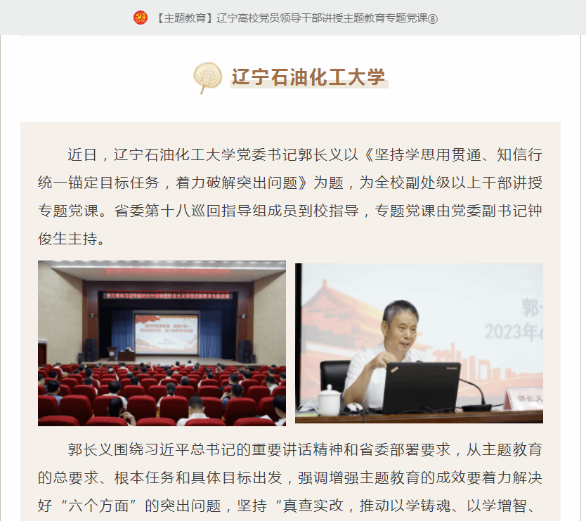 編者按:近日,遼寧高校黨建微信公眾號對遼寧高校黨員領(lǐng)導(dǎo)干部充分發(fā)揮示范帶動學的作用,結(jié)合學習黨的創(chuàng)新理論的思考體會和實際工作,為師生黨員講授專題黨課進行了宣傳,其中對我校黨委書記郭長義以《堅持學思用貫通、知信行統(tǒng)一 錨定目標任務(wù),著力破解突出問題》為題,為全校副處級以上干部講授專題黨課作了報道。現(xiàn)將相關(guān)報道轉(zhuǎn)載如下:
