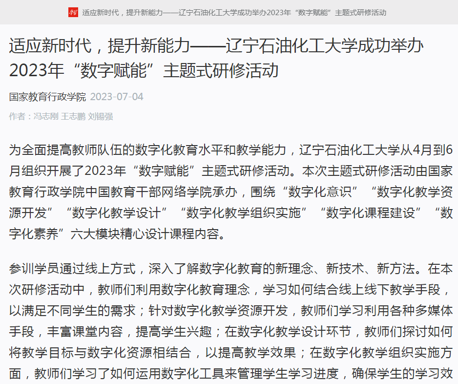編者按:近日,學(xué)習(xí)強(qiáng)國主平臺(tái)、遼寧日報(bào)·北國號、人民日報(bào)客戶端·人民號以《適應(yīng)新時(shí)代,提升新能力——遼寧石油化工大學(xué)成功舉辦2023年“數(shù)字賦能”主題式研修活動(dòng)》為題,對我校以學(xué)促干,從4月到6月組織開展了2023年“數(shù)字賦能”主題式研修活動(dòng),全面提高教師隊(duì)伍的數(shù)字化教育水平和教學(xué)能力,推動(dòng)學(xué)校高質(zhì)量發(fā)展作了報(bào)道。現(xiàn)將相關(guān)報(bào)道轉(zhuǎn)載如下: