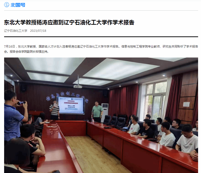 編者按:近日,遼寧日報·北國號對東北大學教授、國家級人才計劃入選者楊濤應邀來遼寧石油化工大學作學術報告,信息與控制工程學院專業(yè)教師、研究生共同聆聽了學術報告會進行了宣傳報道。現(xiàn)將相關報道轉(zhuǎn)載如下: