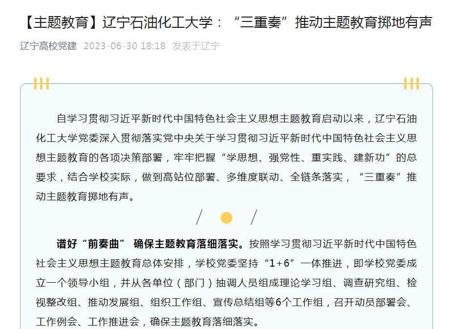 編者按:近日,遼寧高校黨建微信公眾號對我校牢牢把握“學(xué)思想、強(qiáng)黨性、重實踐、建新功”的總要求,結(jié)合學(xué)校實際,做到高站位部署、多維度聯(lián)動、全鏈條落實,“三重奏”推動主題教育擲地有聲作了報道,文章由寧璇、李一鳴撰寫。現(xiàn)將相關(guān)報道轉(zhuǎn)載如下: