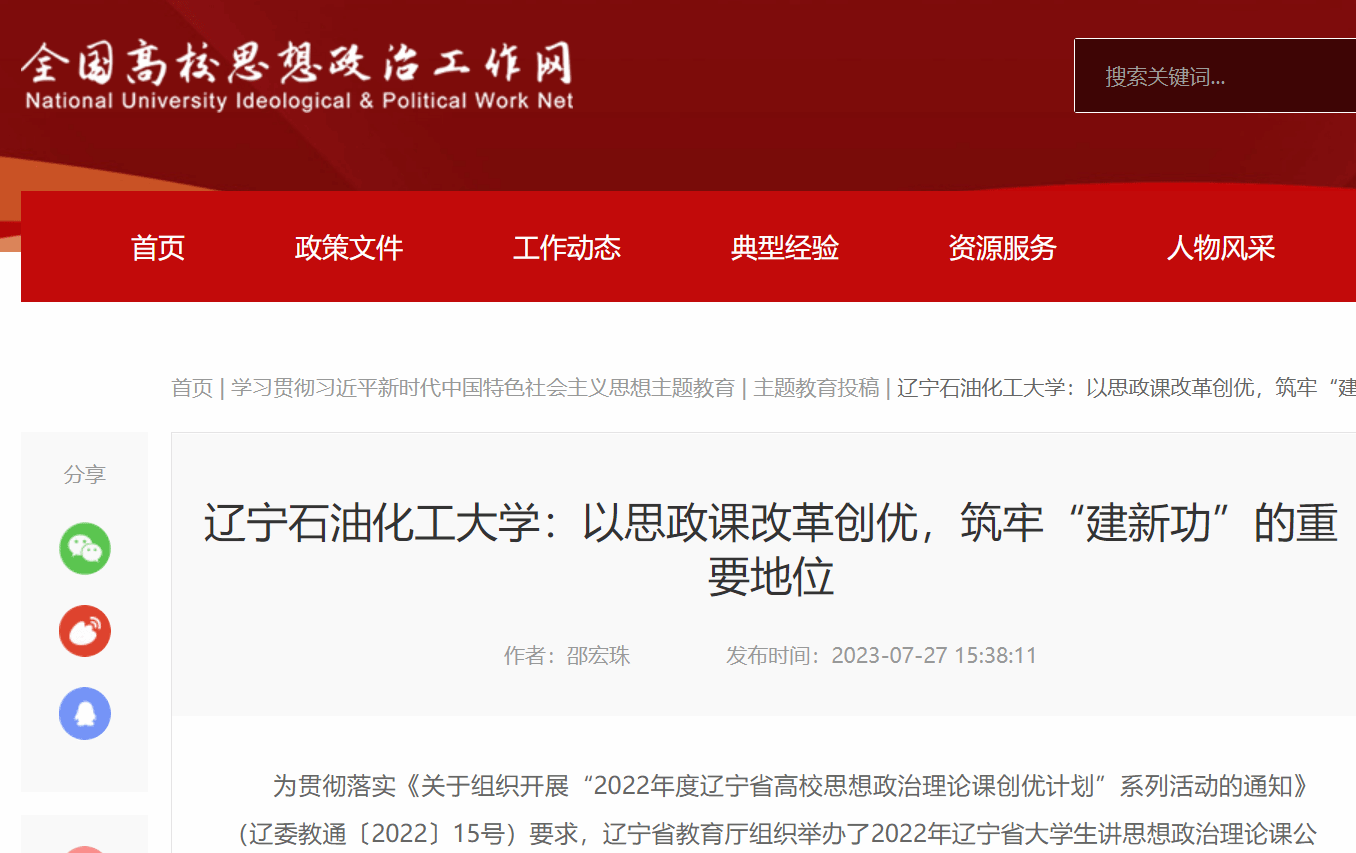 編者按:近日,全國高校思想政治工作網對我校馬克思主義學院以思政課改革創優,筑牢“建新功”的重要地位,在遼寧省大學生講思想政治理論課公開課展示活動中獲獎進行了宣傳報道。現將相關報道轉載如下:
