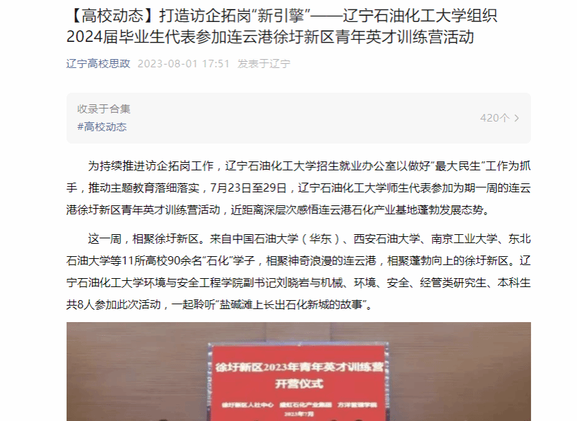 編者按:近日,遼寧高校思政微信公眾號對我校招生就業辦公室以做好“最大民生”工作為抓手,推動主題教育落細落實,組織環境與安全工程學院副書記劉曉巖與機械、環境、安全、經管類研究生、本科生共8人代表參加為期一周的連云港徐圩新區青年英才訓練營活動,近距離深層次感悟連云港石化產業基地蓬勃發展態勢進行了宣傳。現將相關報道轉載如下: