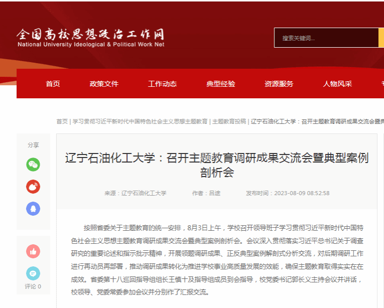 編者按:近日,全國高校思想政治工作網、遼寧日報·北國號等媒體平臺對我校召開領導班子主題教育調研成果交流會暨典型案例剖析會。會議開展領題調研成果、正反典型案例解剖式分析交流,對后期調研工作進行再動員再部署,推動調研成果轉化為推進學校事業高質量發展的效能,確保主題教育取得實實在在成效進行了宣傳報道。現將相關報道轉載如下: