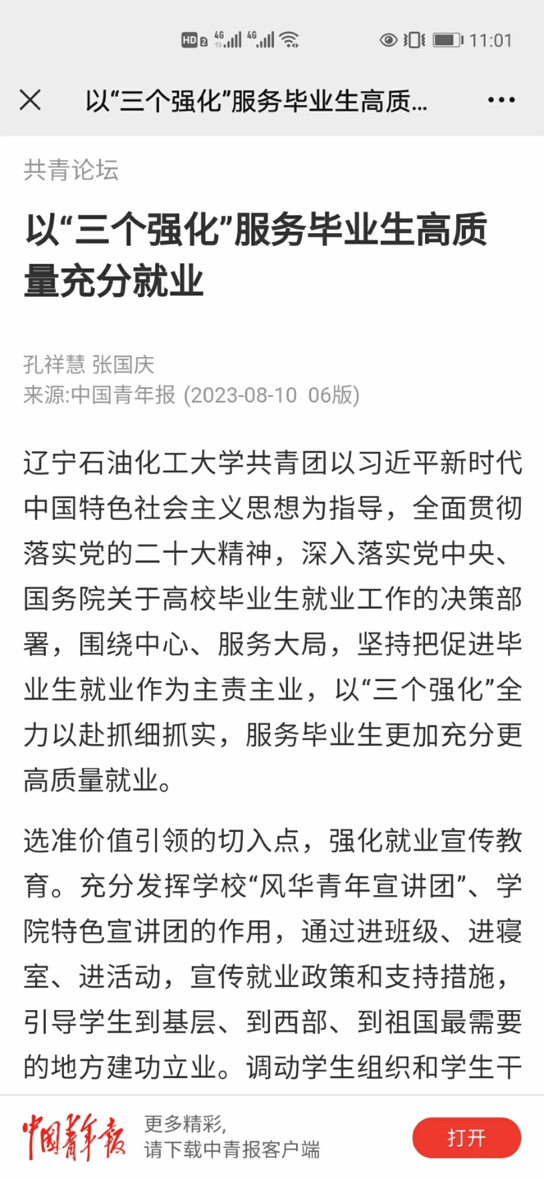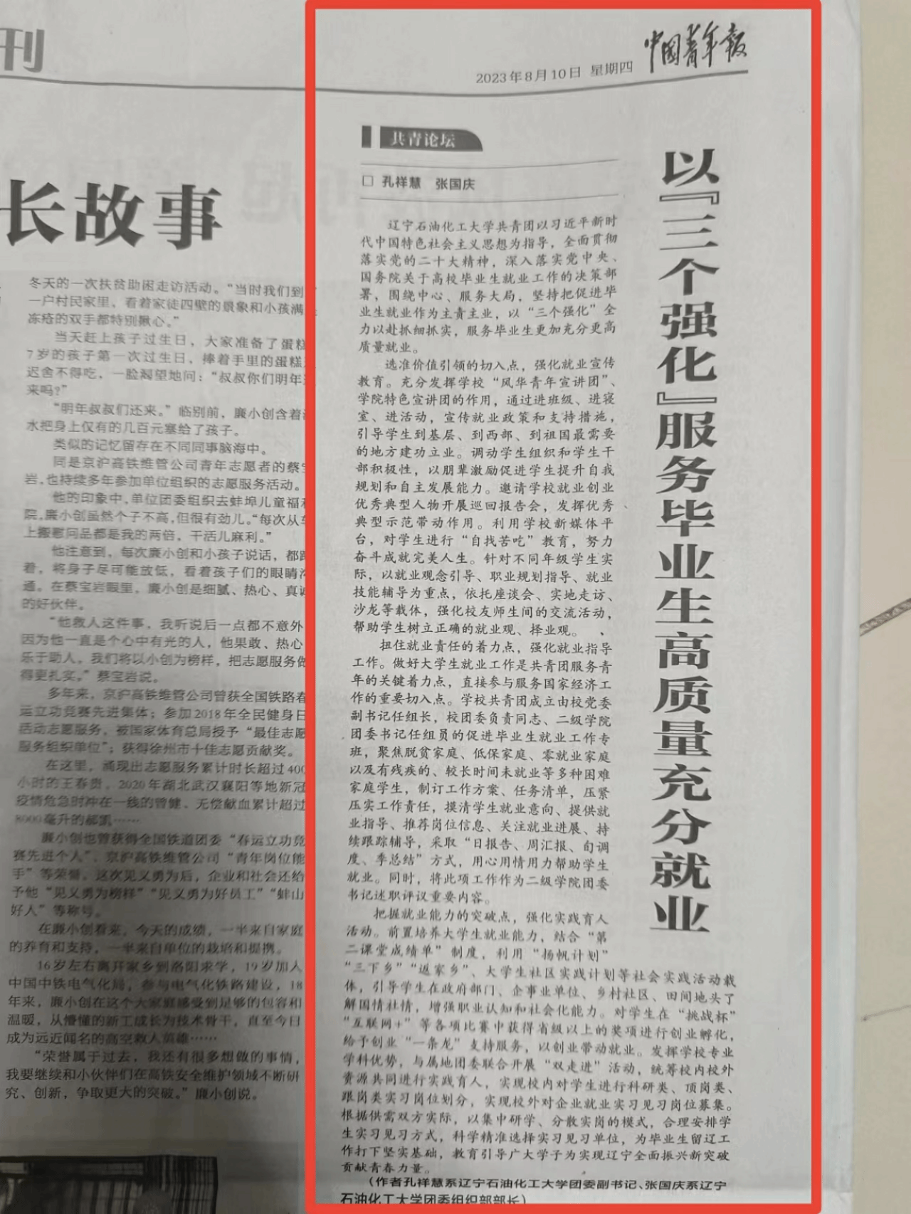 編者按:8月10日,中國青年報第六版以《以“三個強化”服務畢業生高質量充分就業》為題介紹了遼寧石油化工大學共青團工作經驗,學習強國主平臺進行了轉發。現將相關報道轉載如下: