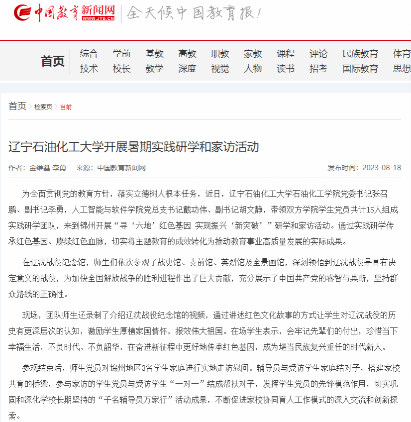 編者按:近日,中國教育新聞網、遼寧日報·北國號以《遼寧石油化工大學開展暑期實踐研學和家訪活動》為題,對我校石油化工學院、人工智能與軟件學院暑期赴錦州開展“尋‘六地’紅色基因 實現振興‘新突破’”研學和家訪活動進行了宣傳報道。現將相關報道轉載如下: