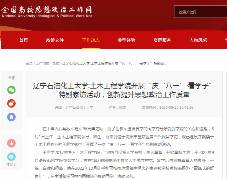 編者按:近日,全國高校思想政治工作網、遼寧日報·北國號等媒體平臺對我校土木工程學院領導、師生一行到位于沈陽市皇姑區曾當兵保留學籍,現已退役并就讀于土木工程專業的王同學家中,開展了一次“慶‘八一’·看學子”特別家訪活動進行了宣傳報道。現將相關報道轉載如下:
