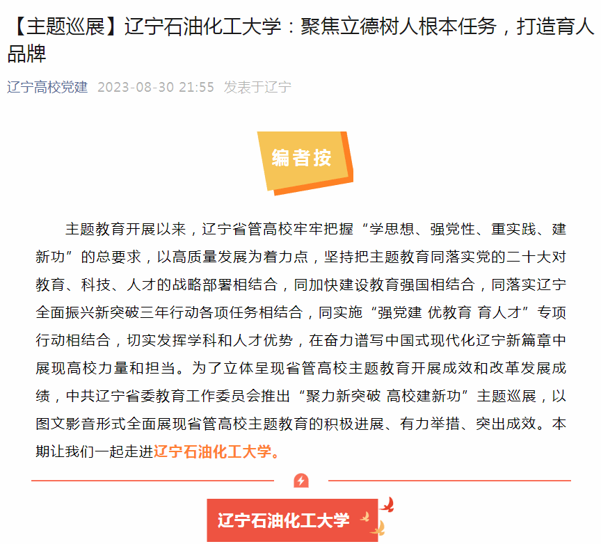編者按:8月30日,遼寧高校黨建微信公眾號以《遼寧石油化工大學:聚焦立德樹人根本任務,打造育人品牌》為題,對我校黨委堅決貫徹落實黨中央決策部署及省委工作要求,嚴格按照“學思想、強黨性、重實踐、建新功”總要求,堅持高站位、嚴要求、實舉措,切實把主題教育成效轉化為落實立德樹人根本任務的強大動力,轉化為踐行為黨育人、為國育才的生動實踐進行了巡展報道。現將相關報道轉載如下: