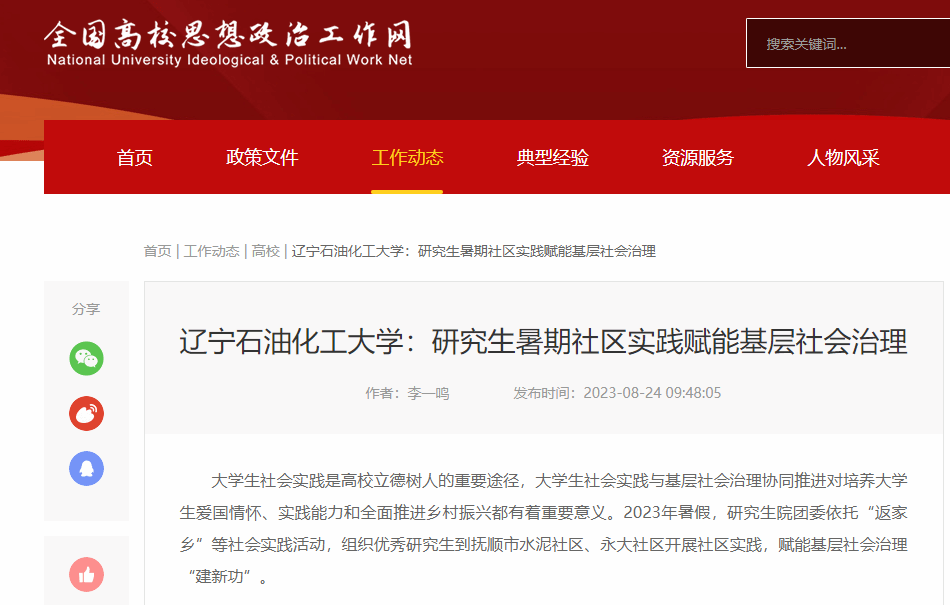 編者按:近日,全國高校思想政治工作網、中國大學生網、中國財經時報網等媒體平臺對我校研究生暑期社區實踐賦能基層社會治理“建新功”進行了宣傳報道。現將相關報道轉載如下:
