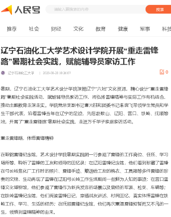 編者按:近日,人民日報客戶端·人民號、遼寧日報·北國號對我校藝術設計學院暑期組織學生黨員開展“重走雷鋒路”社會實踐,體悟雷鋒的成長經歷以及雷鋒精神形成的過程,弘揚雷鋒精神,賦能輔導員家訪工作,傳遞遼石化大真情活動進行了宣傳報道。現將相關報道轉載如下: