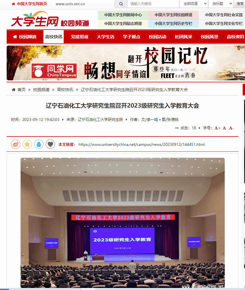 編者按:近日,中國大學生網媒體平臺對我校研究生院召開2023級研究生入學教育大會進行了宣傳報道。現將相關報道轉載如下: