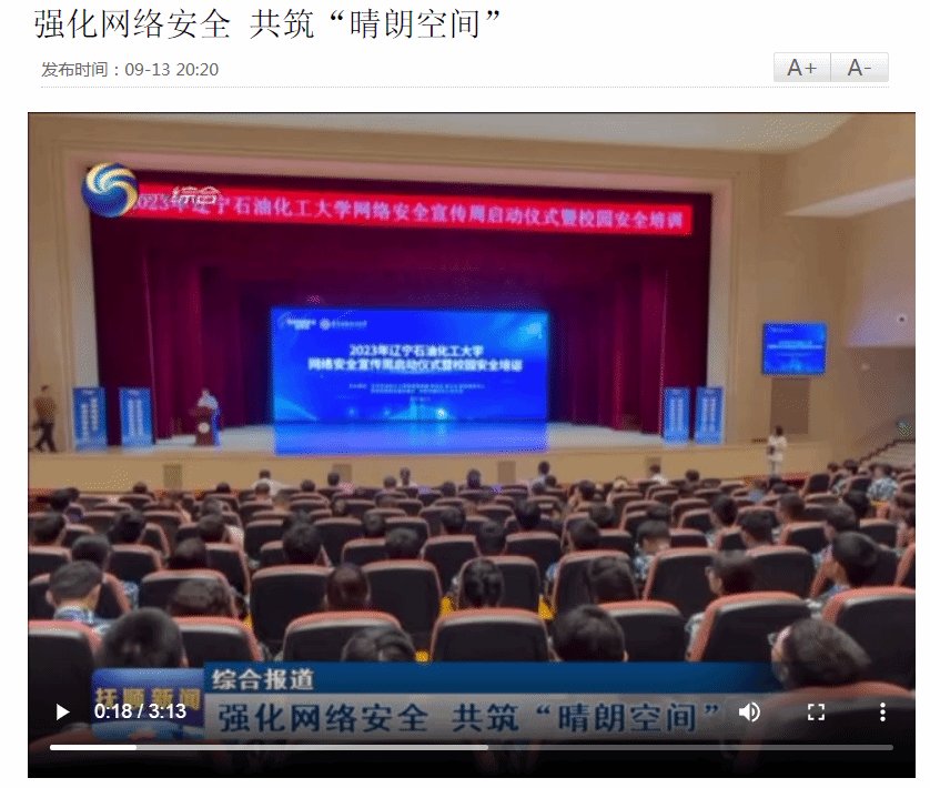 編者按:2023年全國網絡安全宣傳周期間,我校開展了形式多樣,內容豐富的網絡安全宣傳活動,不斷推動網絡安全入腦入心。9月12日,學校舉行了2023年網絡安全宣傳周啟動儀式暨校園安全培訓會,撫順電視臺對此進行了宣傳報道,現將相關報道轉載如下: