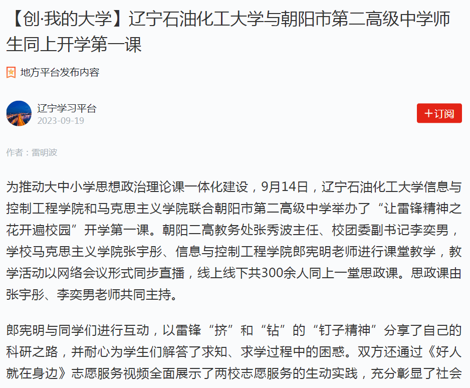 編者按:近日,學習強國遼寧學習平臺對我校信息與控制工程學院和馬克思主義學院聯合朝陽市第二高級中學舉辦了“讓雷鋒精神之花開遍校園”開學第一課進行了宣傳報道。現將相關報道轉載如下: