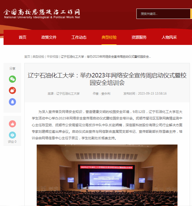 編者按:近日,我校為深入宣傳普及網絡安全知識,營造健康文明的校園安全環境,舉辦了2023年網絡安全宣傳周啟動儀式暨校園安全培訓會。全國高校思想政治工作網、中國大學生在線等媒體平臺對此作了宣傳報道。現將相關鏈接轉載如下: