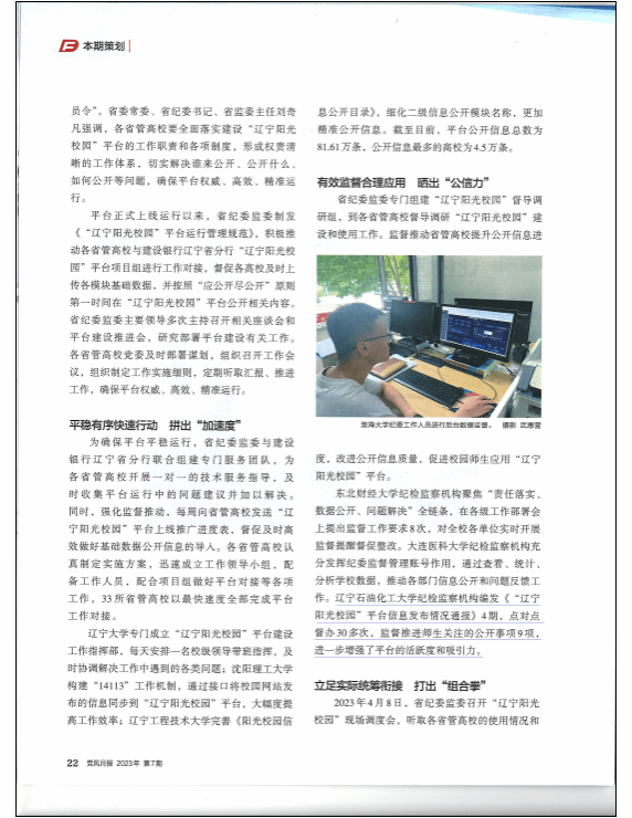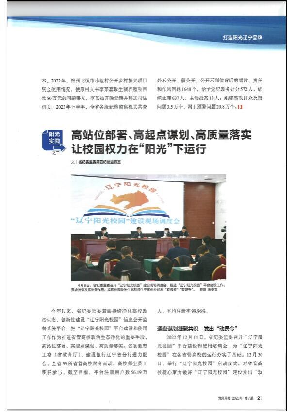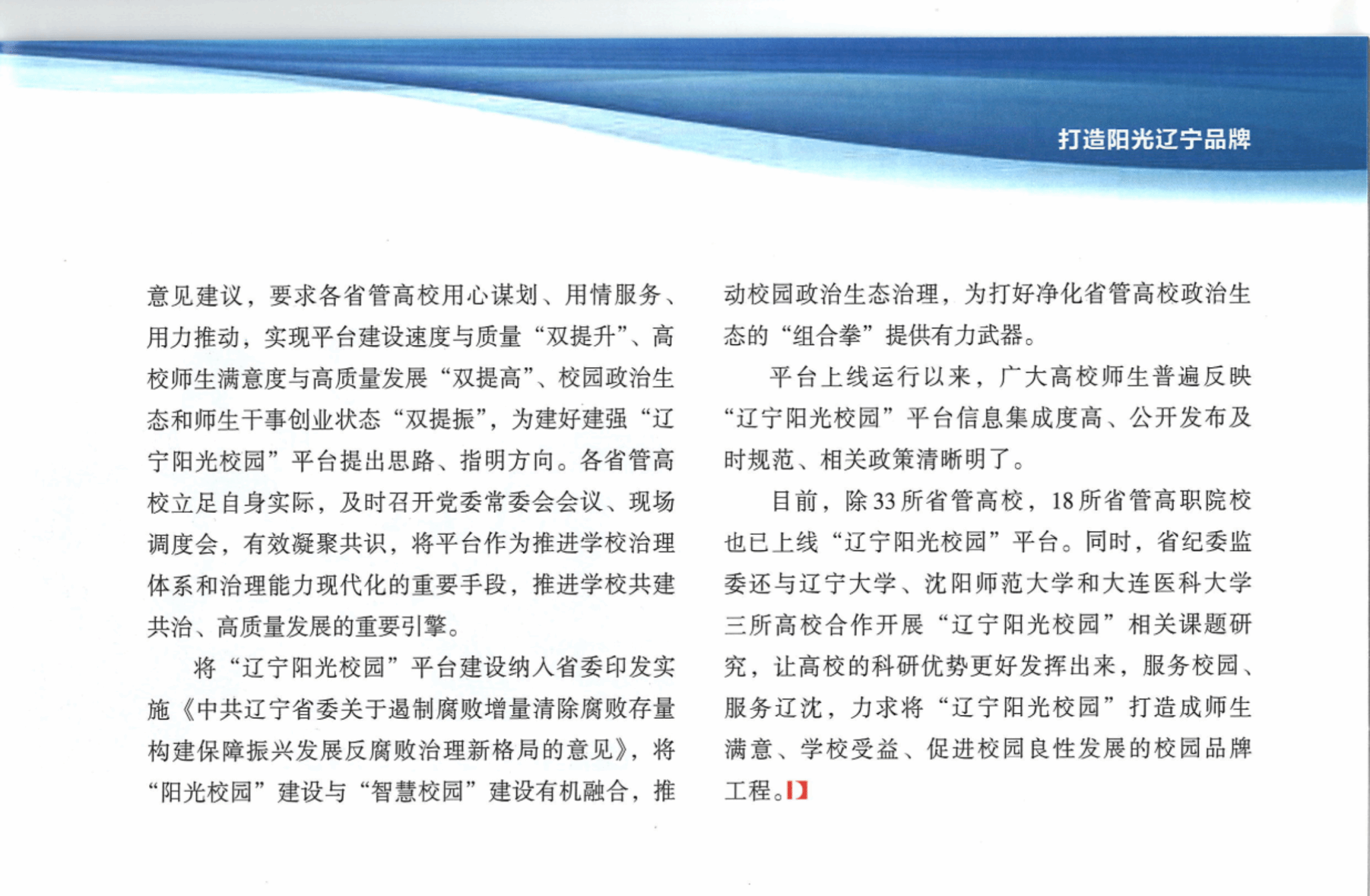 編者按:2023年7月20日,遼寧省紀委監委主辦的雜志《黨風月報》2023年第7期,在以“持續凈化政治生態打造“‘陽光遼寧”’品牌”為題的特別報道中,對我校在落實“遼寧陽光校園平臺”建設工作中的特色做法進行了報道。現將相關報道轉載如下(報道原文附后):