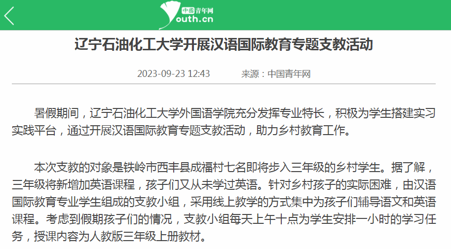 編者按:近日,中國青年網對暑假期間,我校外國語學院充分發揮專業特長,積極為學生搭建實習實踐平臺,通過開展漢語國際教育專題支教活動,助力鄉村教育工作進行了宣傳報道。現將相關報道轉載如下: