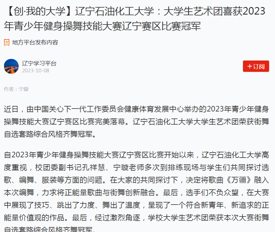 編者按:近日,學習強國遼寧學習平臺、人民日報客戶端·人民號等媒體平臺對我校大學生藝術團喜獲2023年青少年健身操舞技能大賽遼寧賽區比賽冠軍進行了宣傳報道。現將相關報道轉載如下: