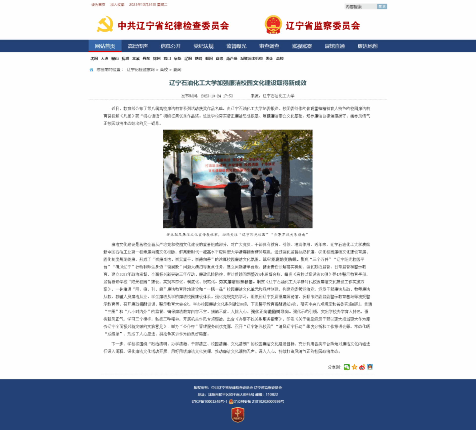 編者按:2023年10月24日,遼寧紀檢監察網以《遼寧石油化工大學加強廉潔校園文化建設取得新成效》為題,對學校近年來持續夯實清正廉潔思想根基、厚植廉潔奉公文化基礎、培養廉潔自律道德操守、涵養風清氣正校園政治生態的實際做法、典型經驗及取得成效進行了宣傳報道。現將相關報道轉載如下: