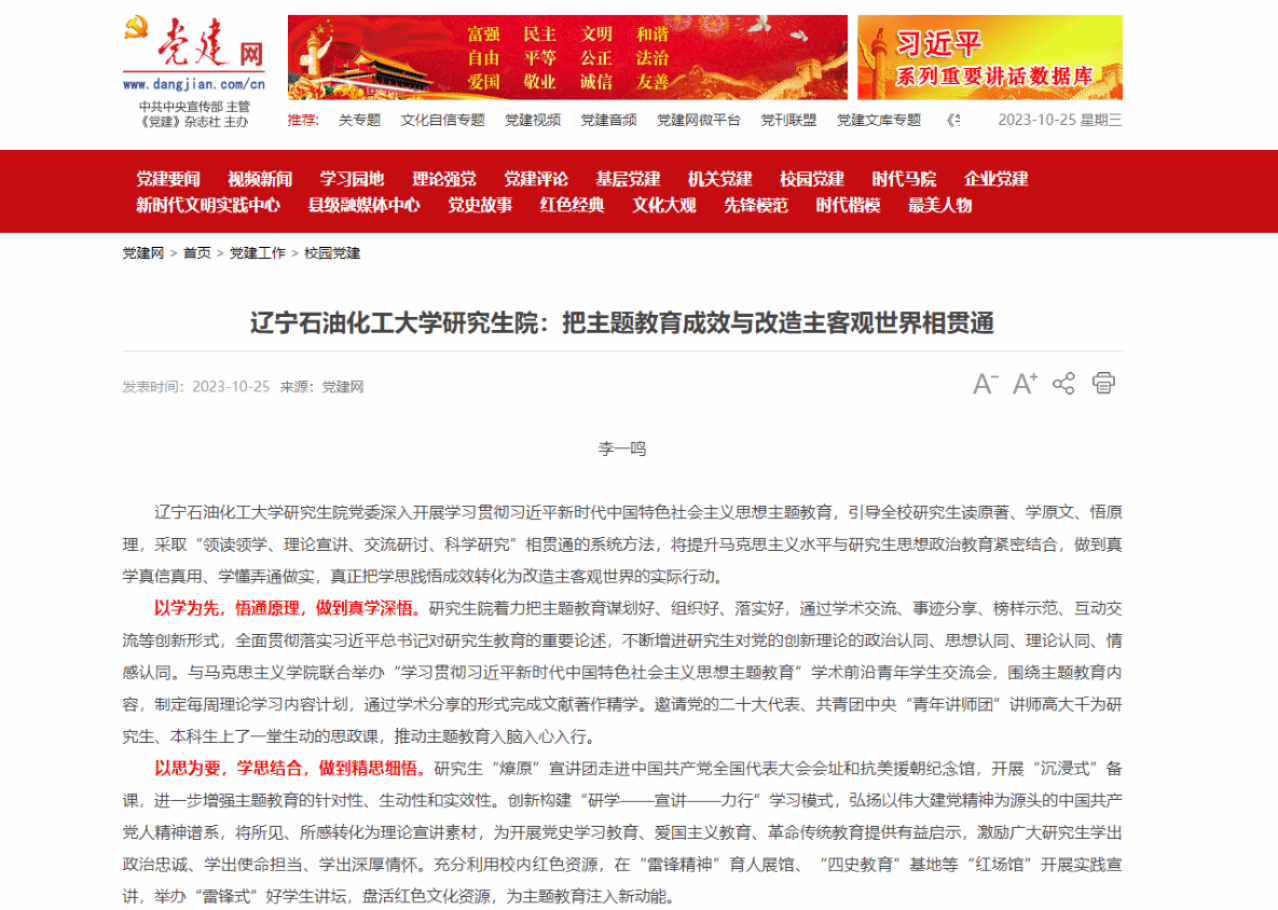 編者按:近日,黨建網對我校研究生院李一鳴老師撰寫的文章《遼寧石油化工大學研究生院:把主題教育成效與改造主客觀世界相貫通》進行了刊載宣傳。現將相關報道轉載如下: