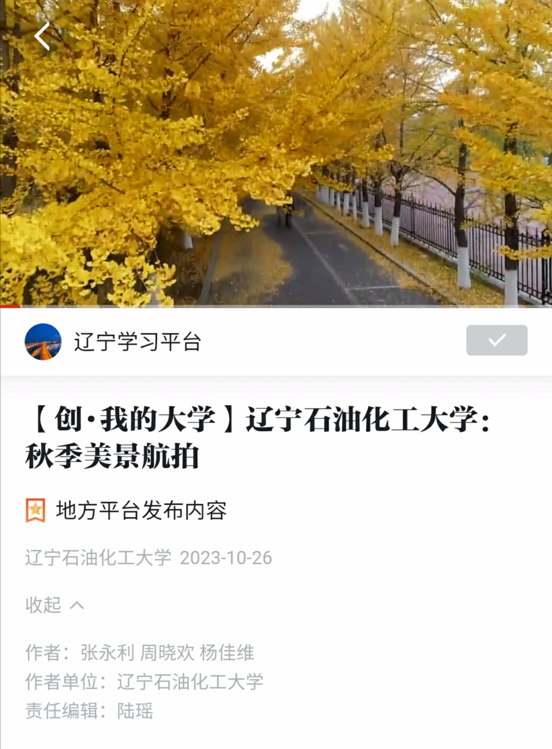 編者按:近日,學習強國遼寧學習平臺、人民日報客戶端·人民號等媒體平臺對我校校園秋季美景航拍進行了宣傳報道。現將相關報道轉載如下: