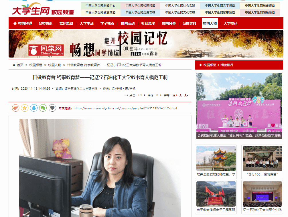編者按:近日,中國大學生網對我校教書育人模范理學院王莉教授事跡進行了宣傳報道。現將相關報道轉載如下: