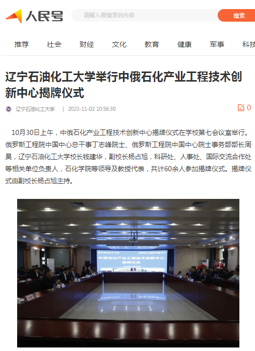 編者按:近日,人民日報客戶端·人民號、遼寧日報·遼望號、中國大學生網等媒體平臺對我校舉行中俄石化產業工程技術創新中心揭牌儀式進行了宣傳報道,現將相關報道轉載如下: