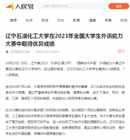 編者按:近日,10月27日-29日,遼寧省2023“外研社·國才杯”“理解當代中國”外語能力大賽遼寧賽區比賽在遼寧大學舉行。經過激烈角逐,我校學生最終6人獲銀獎、7人獲銅獎。人民日報客戶端·人民號、遼寧日報·遼望號、中國大學生網等媒體平臺對此進行了宣傳報道,現將相關報道轉載如下: