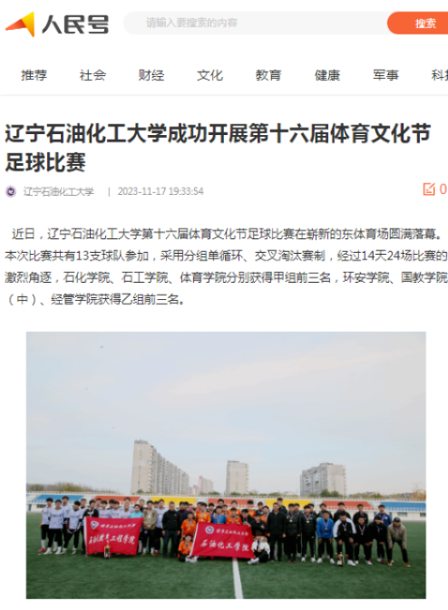 編者按:近日,學習強國遼寧學習平臺、人民日報客戶端·人民號、遼寧日報·遼望號、中國大學生網對我校成功開展第十六屆體育文化節足球比賽進行了宣傳報道。現將相關報道轉載如下: