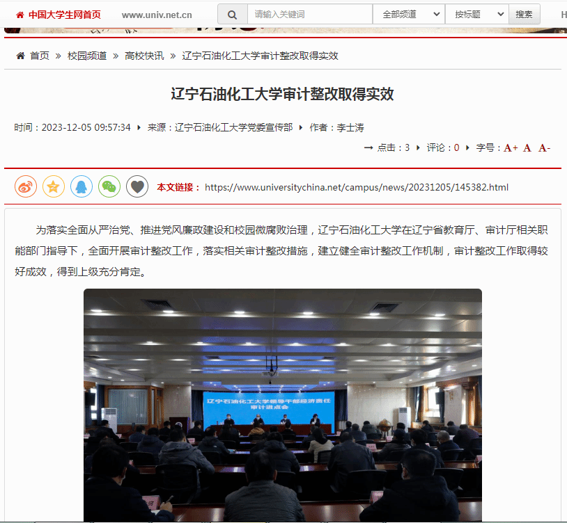 編者按:近日,中國大學生網、遼寧日報·遼望號、人民日報客戶端·人民號對我校為落實全面從嚴治黨、推進黨風廉政建設和校園微腐敗治理,在遼寧省教育廳、審計廳相關職能部門指導下,全面開展審計整改工作,落實相關審計整改措施,建立健全審計整改工作機制,審計整改工作取得較好成效,得到上級充分肯定進行了宣傳報道。現將相關報道轉載如下: