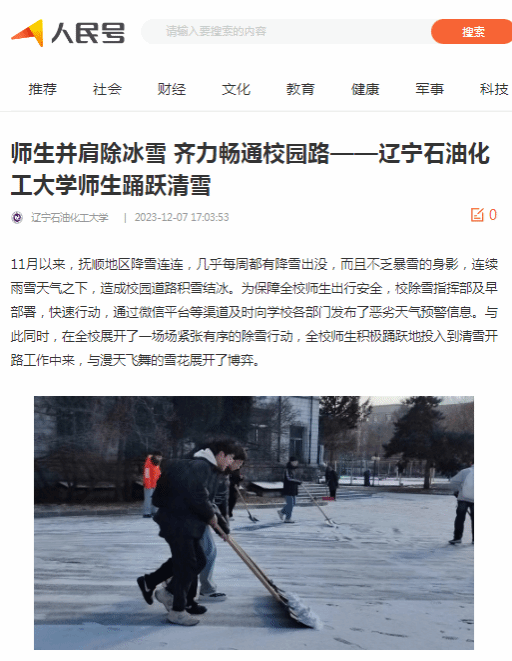 編者按:11月以來,撫順地區降雪連連,幾乎每周都有降雪出沒,而且不乏暴雪的身影,連續雨雪天氣之下,造成校園道路積雪結冰。為保障全校師生出行安全,校除雪指揮部及早部署,快速行動,通過微信平臺等渠道及時向學校各部門發布了惡劣天氣預警信息。與此同時,在全校展開了一場場緊張有序的除雪行動,全校師生積極踴躍地投入到清雪開路工作中來,與漫天飛舞的雪花展開了博弈。中國大學生網、遼寧日報·遼望號、人民日報客戶端·人民號對此進行了宣傳報道。現將相關報道轉載如下: