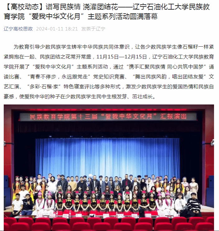 編者按:為教育引導少數民族學生鑄牢中華民族共同體意識,讓各少數民族學生像石榴籽一樣緊緊擁抱在一起、民族團結之花常開常盛,11月15日—12月15日,遼寧石油化工大學民族教育學院開展了“愛我中華文化月”主題系列活動。遼寧高校思政微信公眾號對此進行了宣傳報道,現將相關報道轉載如下: